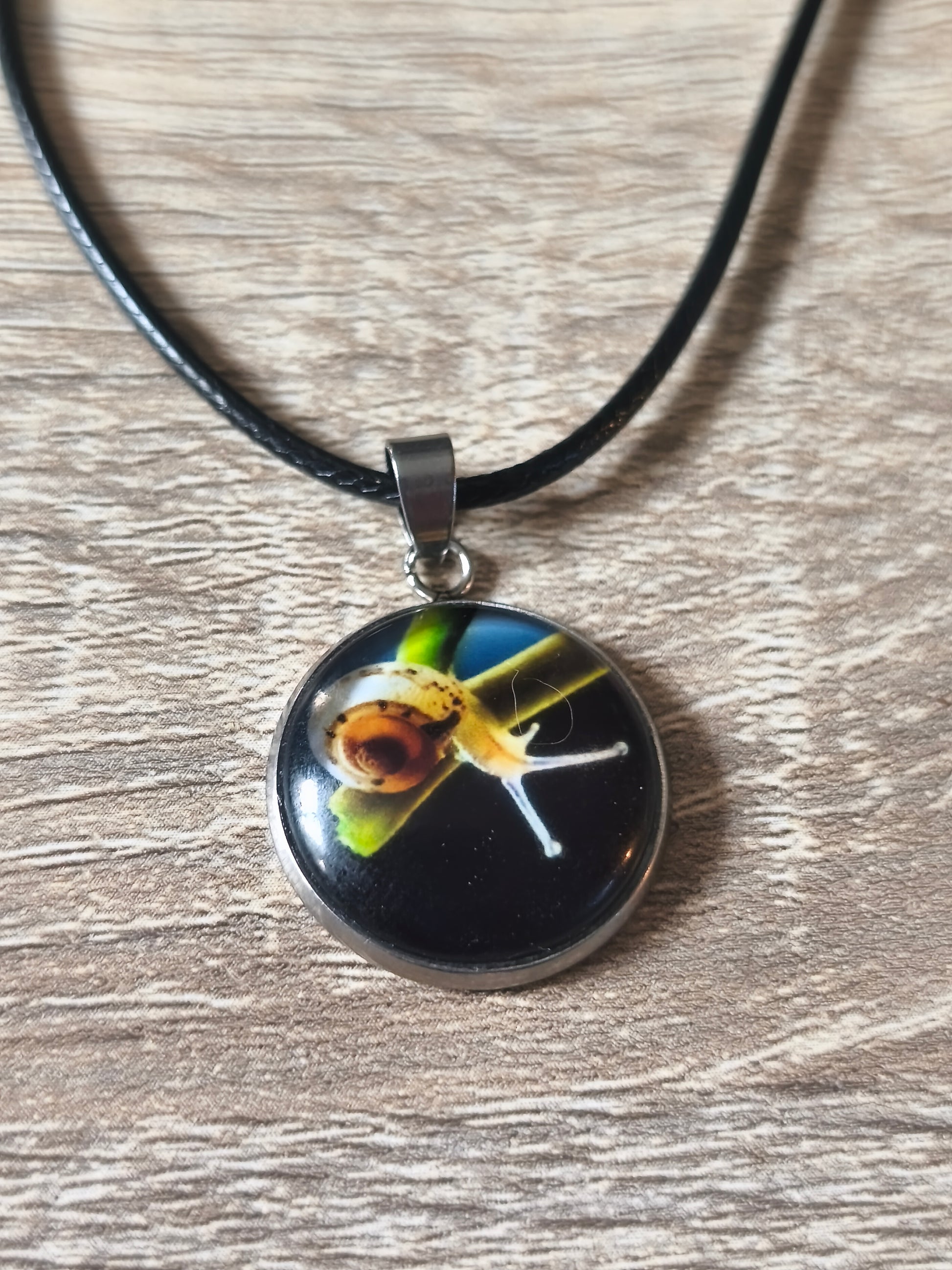 Pendentif motif escargot metal argenté avec son cordon simili cuir